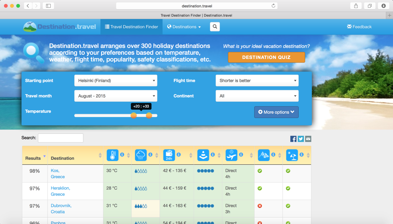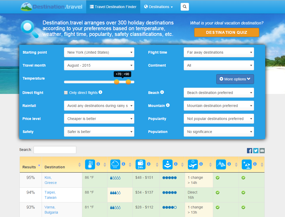 Based on a variety of criteria, in just seconds, Travel Destination Finder offers travelers their ideal travel destination based on personal preferences. Criteria include starting point, desired travel month, ideal temperature, flight time, preferences for proximity to the beach or mountains, desired budget, safety considerations and more. There are over 300 destinations travelers can pick from, along with additional relevant information located on destination-specific pages.