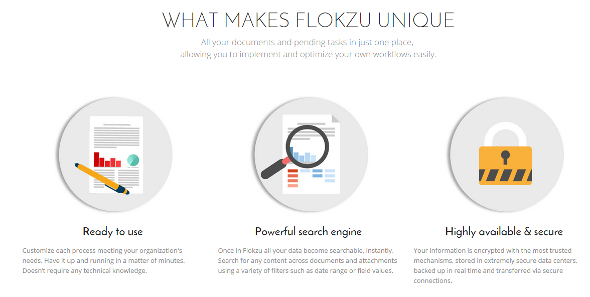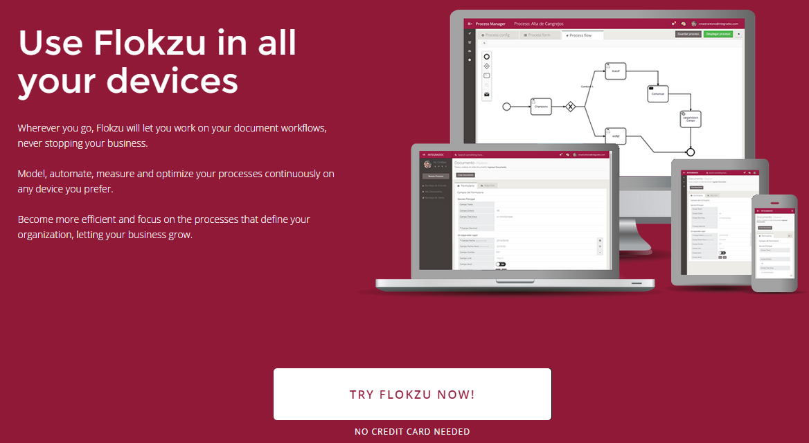 Our solution is ready-to-use, doesn’t require any installations or software downloads. We work under a SaaS methodology. Flokzu aims at Business Process Management (BPM) democratization, a discipline that so far was only available for larger enterprises. By making our product so simple and intuitive, anyone can use it and execute a document workflow within minutes. No need for IT knowledge nor BPM experience.