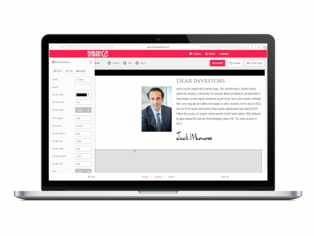 PublishSoSimply is a digital publishing platform for content marketing and inbound marketing strategy. It helps marketers create interactive and responsive docs like white papers, report, ebooks, presentations, guides, case studies, magazines, landing pages and others.