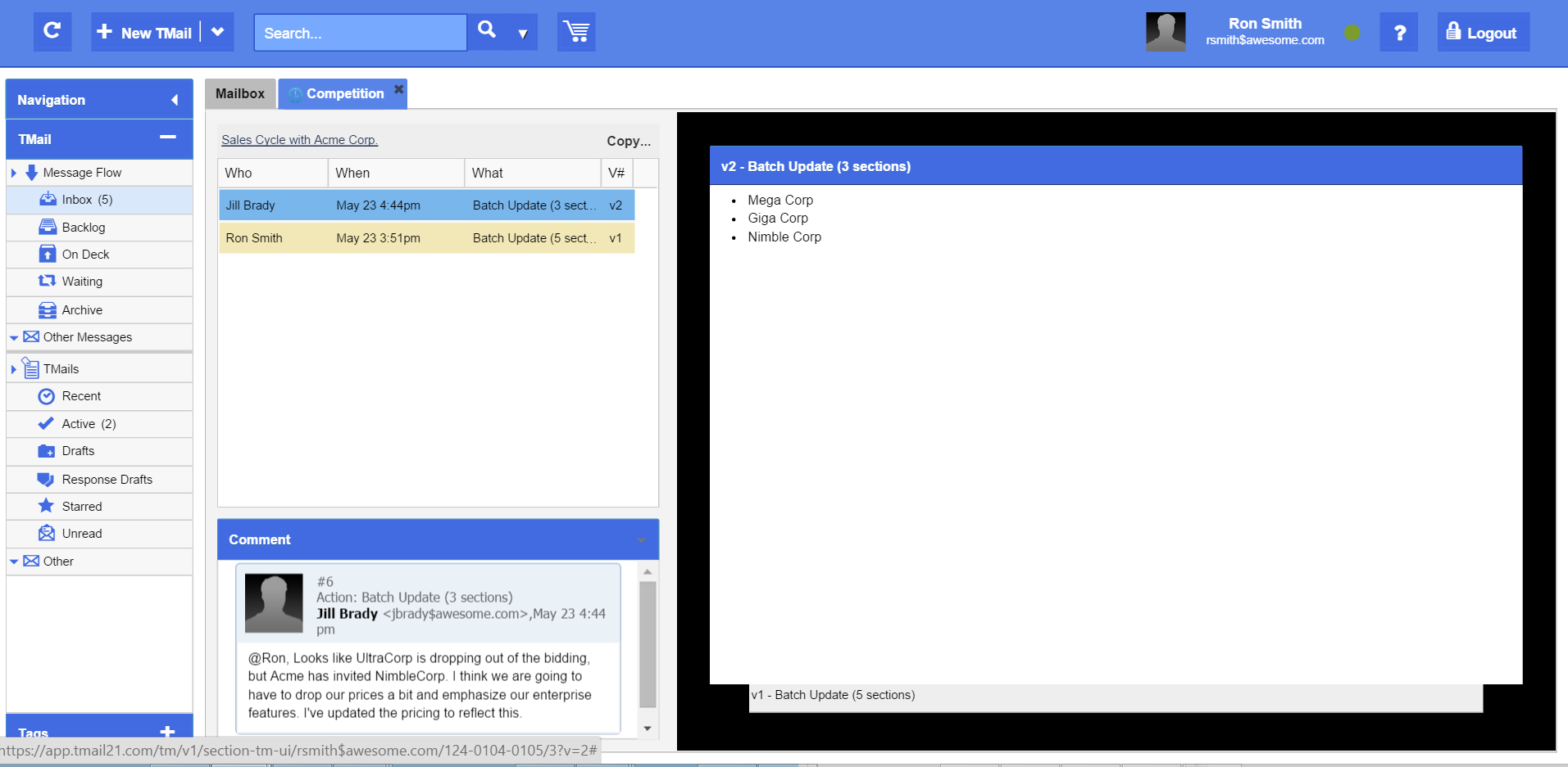 1) Every TMail (the equivalent of an email thread) has an auto-generated friendly, tracking number. This allows TMails to be tied into the broader enterprise ecosystem including chat, spreadsheet, databases, text messaging etc.