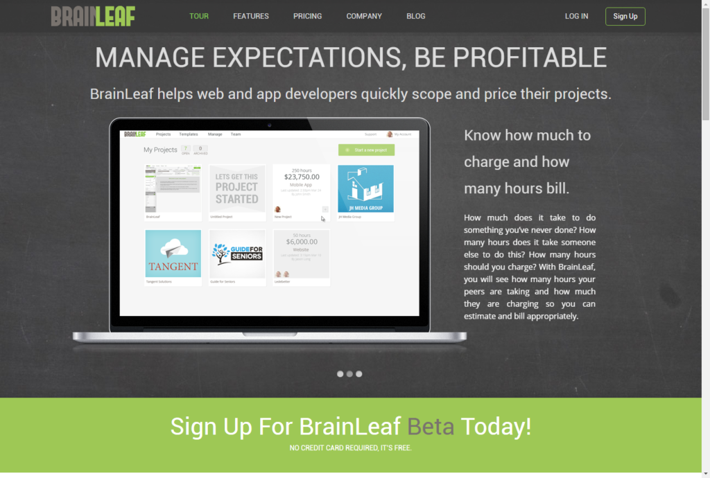 COMPANY: BrainLeaf ELEVATOR PITCH BrainLeaf helps web and app developers quickly scope and price their projects. PRODUCT/SERVICE...