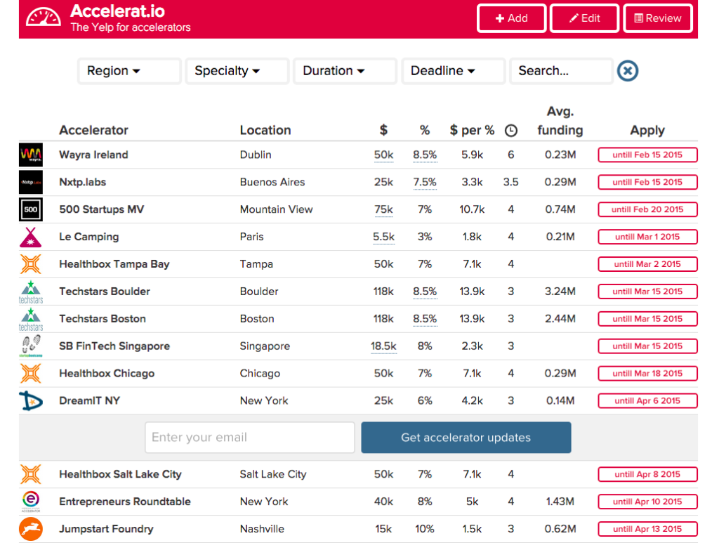 COMPANY: Accelerat.io ELEVATOR PITCH: Yelp for accelerators. PRODUCT/SERVICE DESCRIPTION: Accelerat.io provides clear information on...
