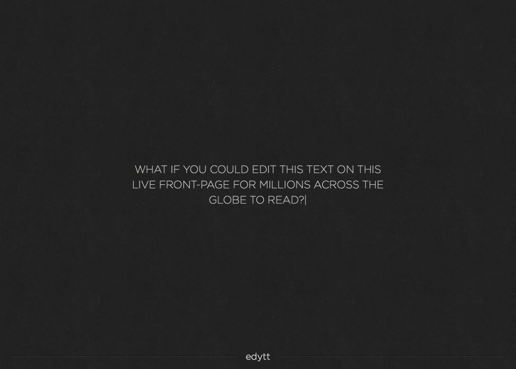 COMPANY: edytt ELEVATOR PITCH: Edit the front page. PRODUCT/SERVICE DESCRIPTION: Edytt.com is a public front page which you can edit using the...