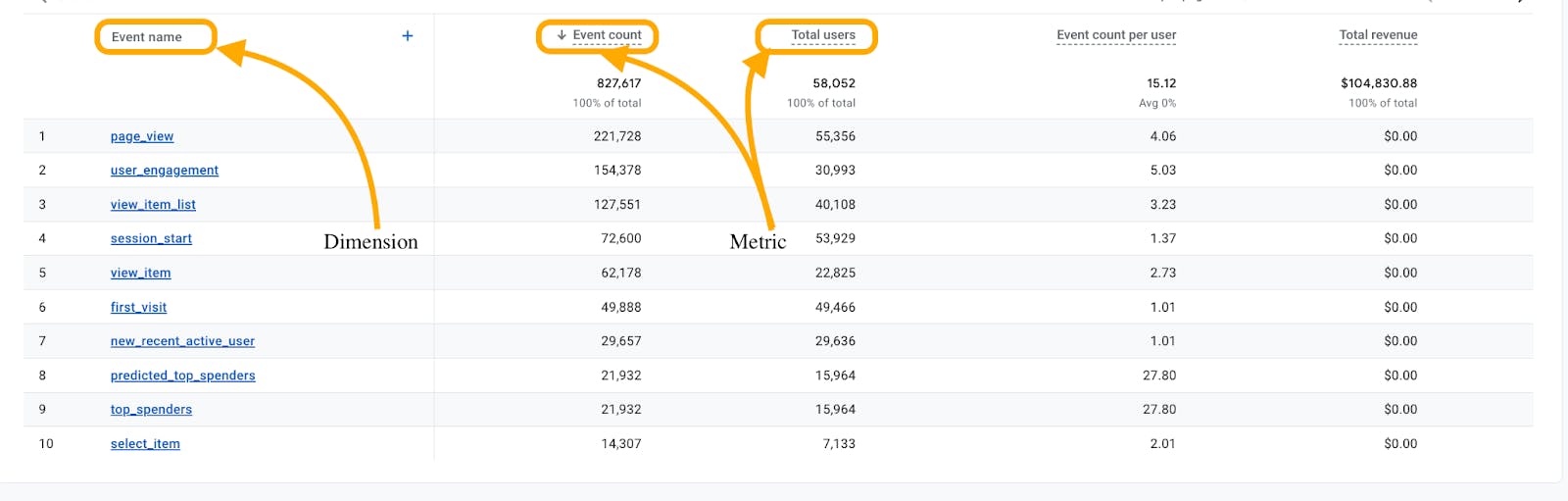 A dimension, usually text instead of figures, is an attribute of your data that describes it. Metrics on the other hand are quantitative measures of your data. An example of a dimension is the name of an event. From our example, the dimension would be “page_view”. The metric would be the number of page views over a selected period.