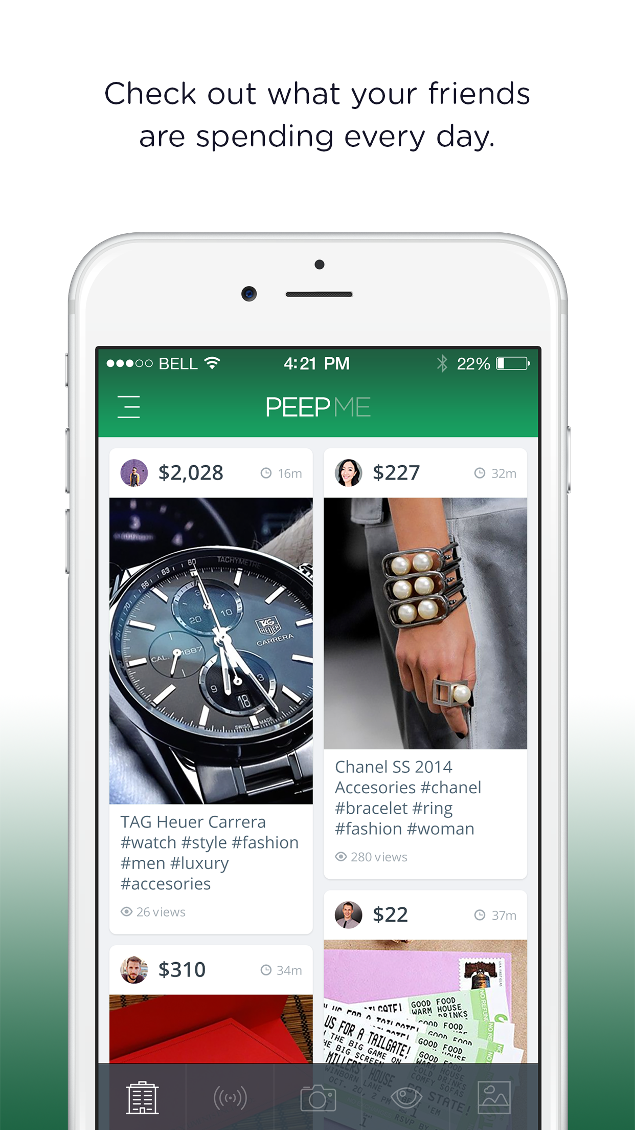Users of Peepme will have the opportunity to publish pictures of products or services they purchased and say how much they spent on it, so that one can see how much the user has spent throughout their timeline.