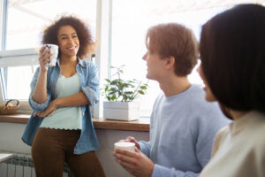 Nice girl is standing and holding a cup of tea. She is looking to her friends and smiling. Guy and another girl are sitting on sofa and smiling to their friend.